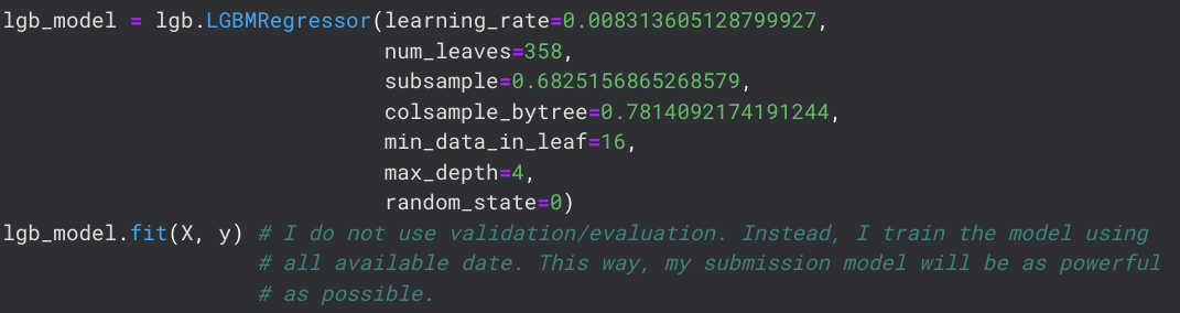 To enter the Kaggle Competition, I need to generate predictions using Kaggle's test data and my newly optimized model. For some reason, optuna returned insane values for the learning_rate parameter, so I manually set it to 0.09, which seemed to work well. I need to look into what I can change about my trials to get a more reasonable learning_rate (I tried many different trials with different intervals but they all returned values that seemed to maximize, not minimize, my MAE).The specific model I use for my competition predictions is trained using the following code.