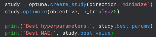 Optuna is the hyperparameter tuning tool used by the Kaggle community. Due to its popularity and good performance, I also want to start using it. There were several good tutorials online but the most helpful one I found was this one.In simple terms, Optuna allows you to define the parameters you want to tune and then it automatically runs a specified number of models with different combinations of those parameters. While running, it optimizes for a metric such as RSME or MAE (depending on the analyst's choice). I chose to optimize learning_rate, max_depth, and min_data_in_leaf. The optimization metric is set to MAE because this is the metric on which the Kaggle Competition is ultimately scored.